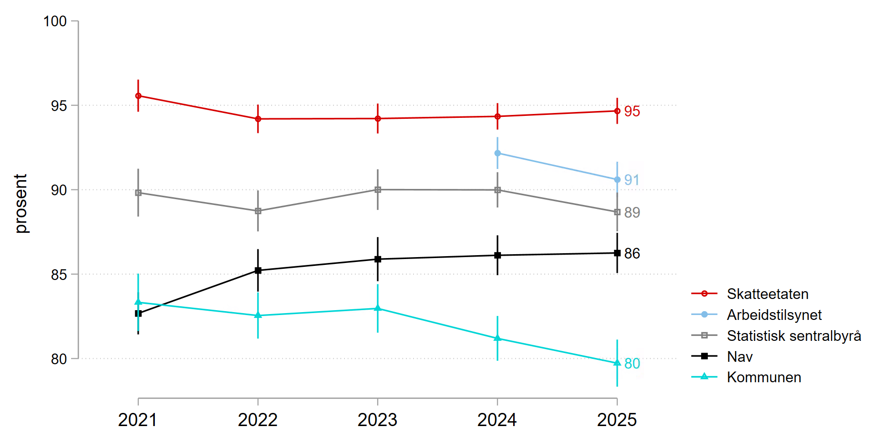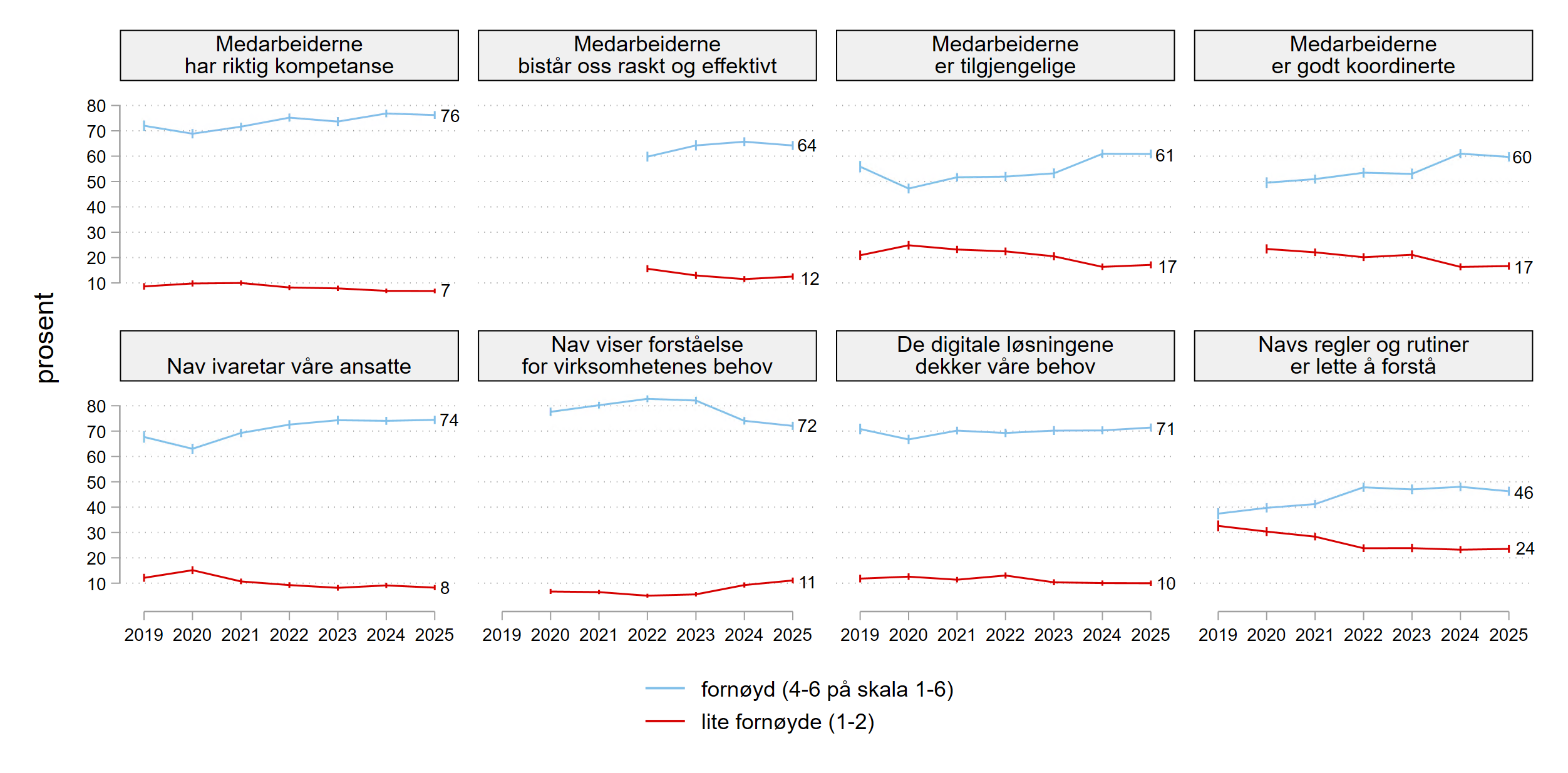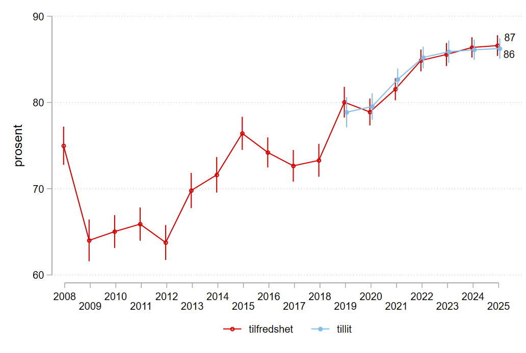 Etter flere år med økning i tilfredsheten fram til 2022, har det i 2023-2025 ikke vært noen signifikant endring (Figur 2.1). I år er 87 prosent fornøyde. Denne utflatingen kommer etter kraftig økning fra 2018 til 2022 (totalt 12 prosentpoeng). Halvparten av denne økningen, fra 74 til 80 prosent, kom fra 2018 til 2019. Det skyldtes antagelig økt tilfredshet med nye digitale løsninger for arbeidsgivere, spesielt for sykefraværsoppfølging (Nav 2019). 2019 var det første året vi stilte spørsmål om tilliten til Nav, som følger tilfredsheten tett.