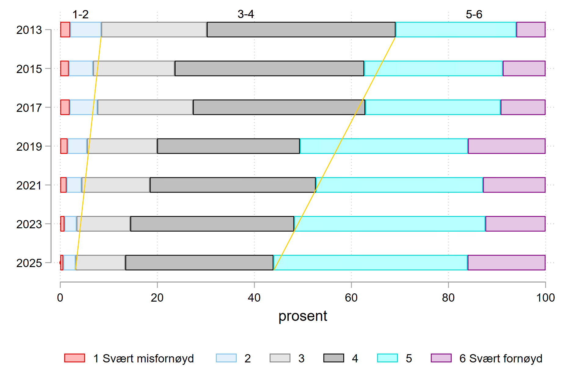 En annen innfallsvinkel (Figur 2.2) til å vise utviklingen i tilfredsheten er å skille mellom de som er minst fornøyde (1-2), middels fornøyde (3-4) og mest fornøyde (5-6). De minst fornøyde er kraftig redusert (fra 11 % i 2012 til 3 % i 2025). Samtidig er andelen middels fornøyde redusert fra 62 prosent i 2012 til 41 prosent i 2025. Andelen mest fornøyde er mer enn doblet fra 27 prosent i 2012, til 56 prosent i år. Det kan argumenteres for at de minst og mest fornøyde er mest interessante, og det er positivt at det nå er så få som er sterkt misfornøyde med Nav. På den annen side viser de 41 prosent middels fornøyde i årets undersøkelse at det gjenstår betydelig potensial for å forbedre tjenestene og brukeropplevelsene også fremover.