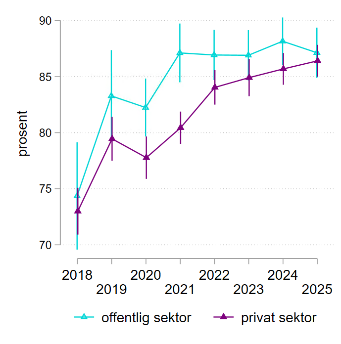Siden 2019 har både private og offentlige virksomheter hatt en økning i tilfredshet (Figur 2.3). Det ble forskjell mellom sektorene i 2020 i forbindelse med pandemien, da en del virksomheter i privat sektor trolig opplevde at utbetalinger fra Nav ikke kom raskt nok og at Navs tjenester/ytelser ikke dekket deres behov (Nav 2020). Forskjellen økte i 2021 (87 % i offentlig sektor og 80 i privat sektor). Fra 2022 har tilfredsheten økt blant de private virksomhetene, og det ikke signifikant forskjell i tilfredshet mellom sektorene. Med andre ord det ut til at Nav lykkes med å ivareta begge sektorer like godt.
