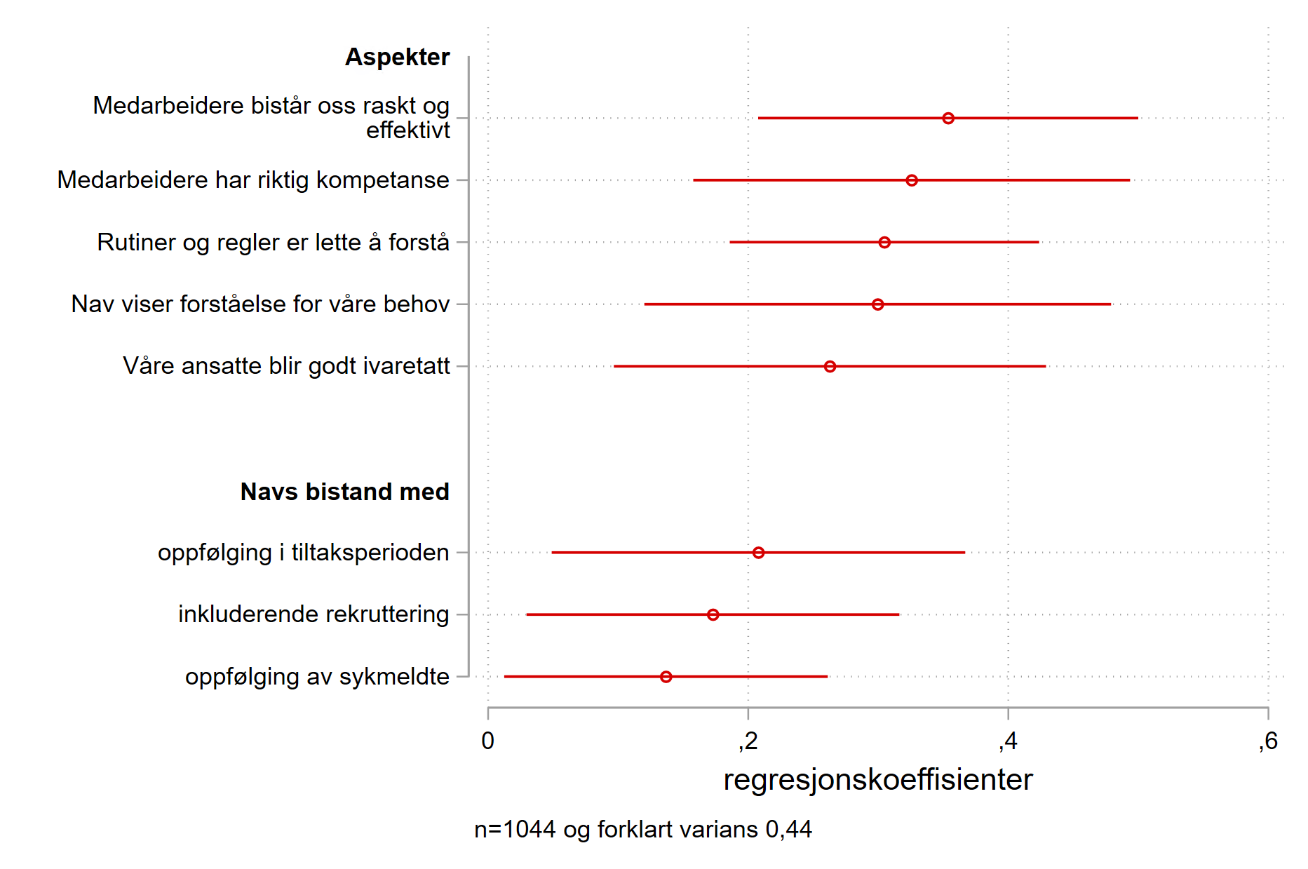 I regresjonen er de uavhengige variablene (tilfredshet med aspekter og tjenester) dikotome. Variablene har 1-verdi for fornøyd (4-6) og 0-verdi for misfornøyd (1-3). Koeffisientene viser forskjellen i gjennomsnittlig tilfredshet mellom gruppe 0 og 1 etter det er kontrollert for de andre uavhengige variablene i modellen.↩︎