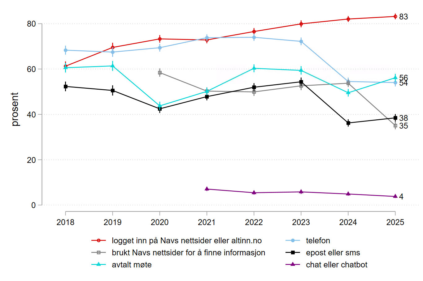 Figur 3.1 oppsummerer hvordan virksomhetene har kontakt med Nav. Mest brukt er innlogging på Navs selvbetjeningsløsninger (på nav.no, min side-arbeidsgiver, arbeidsplassen.no eller altinn.no). Andelen har økt fra 61 prosent i 2018 til 83 prosent i 2025, i tråd med introdusering av mange nye digitale løsninger. Økt bruk av løsningene henger sammen med at de er obligatoriske på en del områder, eksempelvis i forbindelse med oppfølging av sykefravær. Offentlig sektor har høyere andeler enn privat sektor, men økningen over tid er om lag den samme (ikke vist i figur).