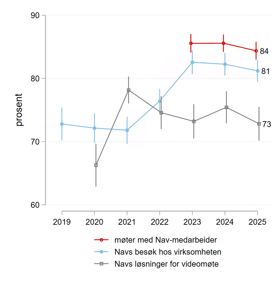 I år har andelen som oppgir at de har hatt avtalt møte med en Nav-medarbeider (for eksempel hos virksomheten, på telefon eller hos NAV) økt til 56 prosent, etter reduksjon i fjor (fra 59 % til 50 %). De offentlige virksomhetene har i langt høyere grad møte med Nav-medarbeidere enn de private, 67 versus 52 prosent (ikke vist i figur). Vi antar at dette har sammenheng med at offentlige virksomheter i større grad har kontakt med Nav på områder der det er vanlig med møter (som oppfølging og forebygging av sykefravær).