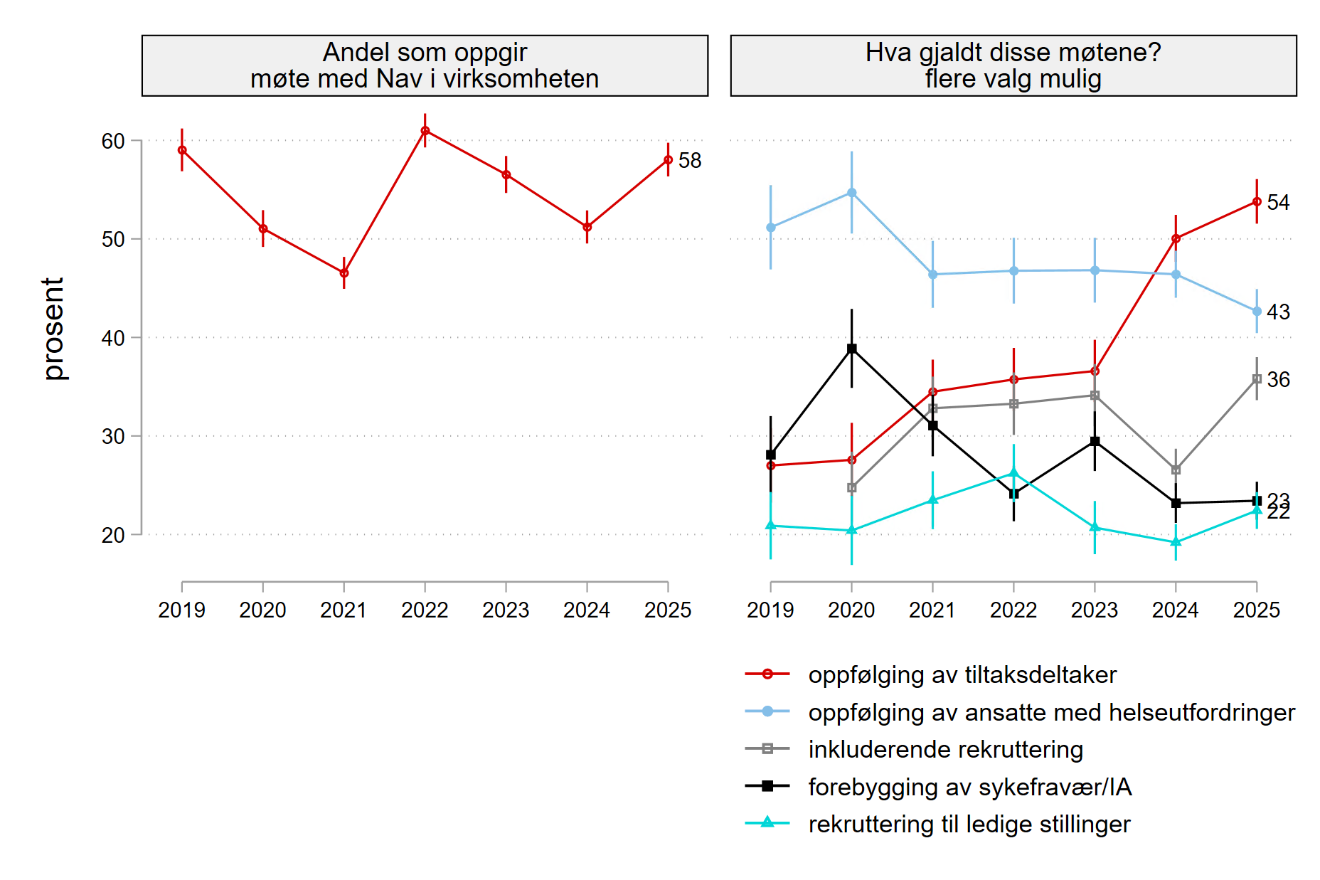 De som svarte på spørsmålet om tilfredshet med Navs besøk hos virksomheten (svarte 1-6) fikk et oppfølgende spørsmål om hva besøkene fra Nav til virksomheten gjaldt. I Figur 3.4 vises til venstre andelen som oppgir at et møte med Nav fant sted på arbeidsplassen.2 Andelen har variert en del siden 2019.