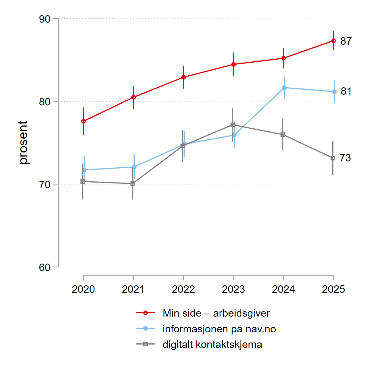De senere årene er det gjort mye for å utvikle de digitale grenseflatene for virksomhetenes kontakt med Nav, noe som avspeiles i virksomhetenes vurdering (Figur 3.5). Tilfredsheten med «Min side – arbeidsgiver» har økt til 87 prosent i år. Denne siden er en viktig inngang for virksomhetene til Navs innloggede løsninger og er sentral i samhandlingen med Nav om rekruttering, tiltak og oppfølging, og forebygging av sykefravær. En nesten like høy andel er fornøyde med informasjonen på nav.no, som også har økt betydelig de siste årene. Som tidligere vist (Figur 3.1) oppgir virksomhetene mindre bruk av informasjonen på nav.no i år, muligens på grunn av KI. For det digitale kontaktskjemaet, der arbeidsgivere kan skrive til Nav for å få hjelp med å rekruttere og inkludere arbeidstakere eller forebygge sykefravær, har andelen fornøyde vært stabil på rundt 75 prosent siden 2022, med en nedgang til 73 prosent i år.