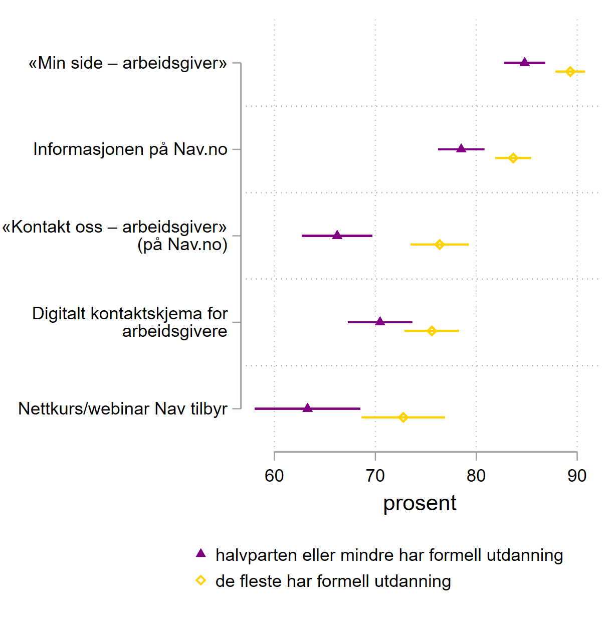 Virksomhetenes vurdering av disse digitale løsningene for kontakt med Nav er, med unntak av «Kontakt oss – arbeidsgiver», høyere blant virksomheter hvor de fleste ansatte har formell utdanning (Figur 3.6). Det kan bety at kompetansenivået i virksomheten har betydning for hvordan de nyttiggjør seg og opplever Navs digitale kanaler, men det kan også skyldes at virksomhetene med lavere kompetansenivå kan ha ansatte med andre behov enn de med høyere kompetansebehov.