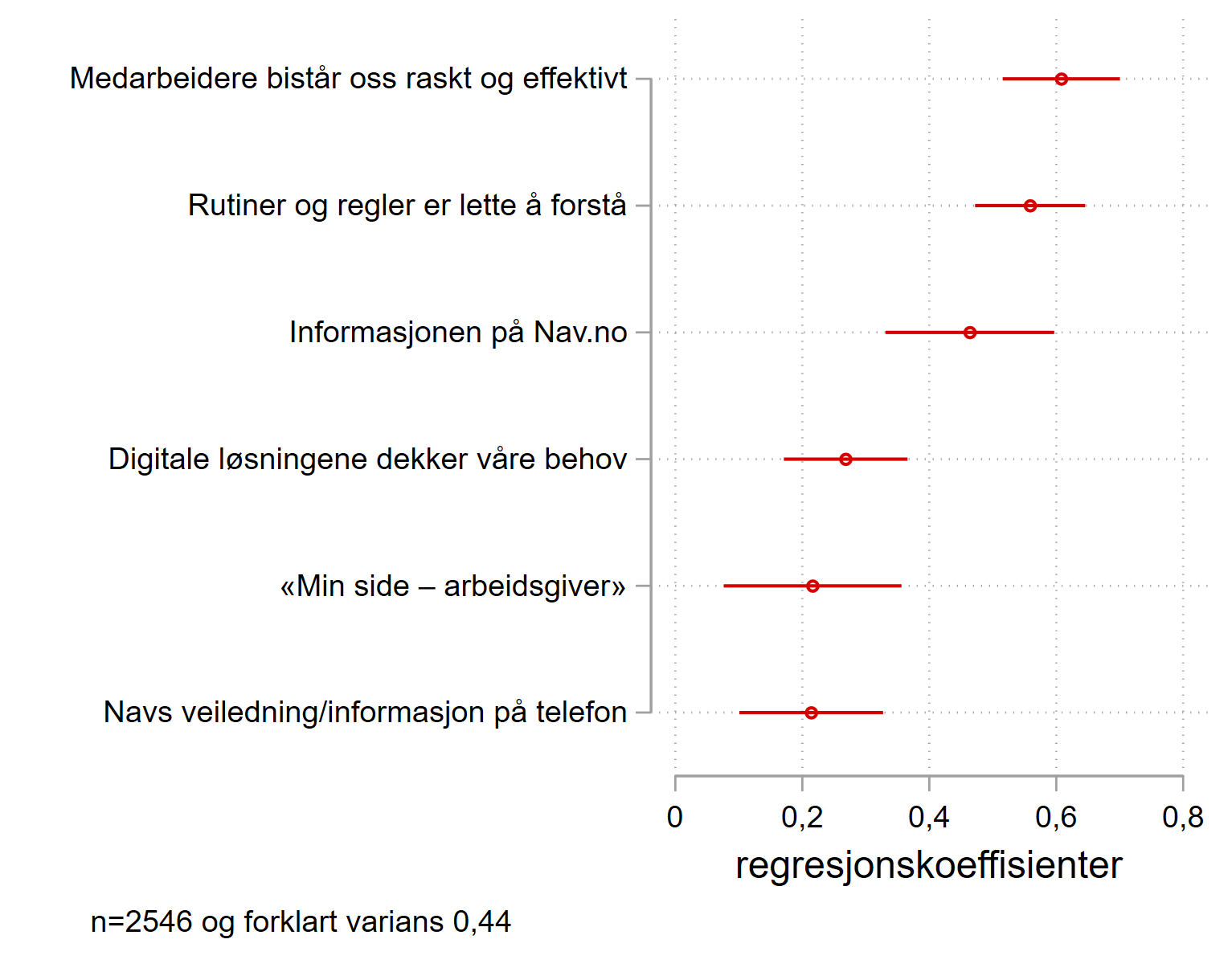 Vi undersøkte sammenhengen mellom virksomhetenes svar på spørsmålet om Navs informasjon er klar og forståelig, ulike aspekter ved samhandlingen (omtalt i del 2-2) og ulike kanaler/kontaktformer.4 Figur 3.7 viser bare de dimensjonene som har signifikant sammenheng med spørsmålet om klarspråk.5 Høyere regresjonskoeffisienter betyr at den statistiske sammenhengen er sterkere, uten at dette nødvendigvis er ensbetydende med at det er årsakssammenheng.