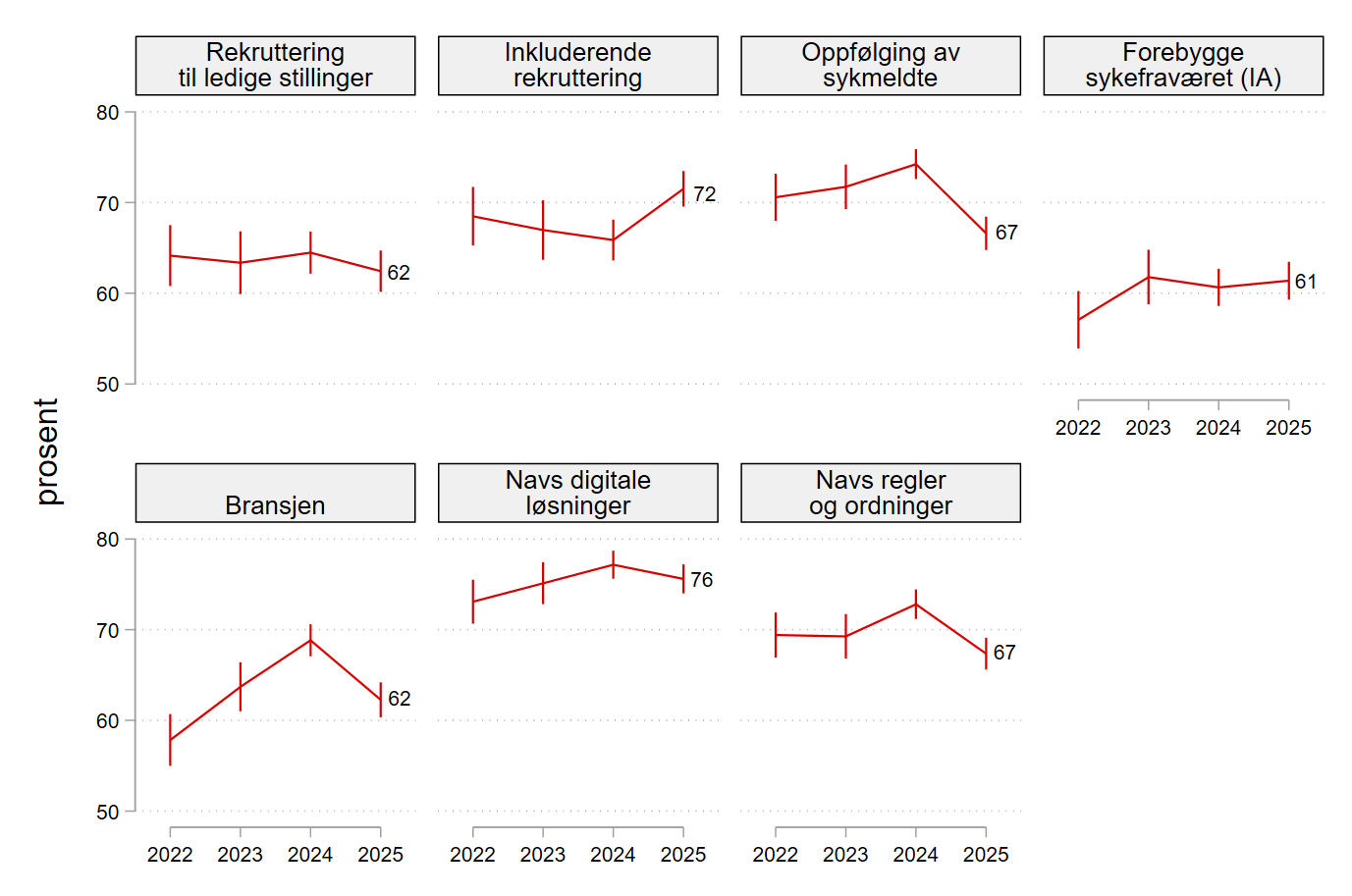 På tre kompetanseområder er det tilbakegang i andelen fornøyde virksomheter fra 2024 til 2025: oppfølging av sykmeldte, Navs regler og ordninger og kjennskap til virksomhetens bransje. Disse tre har sterk sammenheng1 med tilfredsheten med Navs bistand med oppfølgingen av sykmeldte (som har gått ned fra i fjor, se neste kapittel) og bistanden med forebygging av sykefravær (IA).