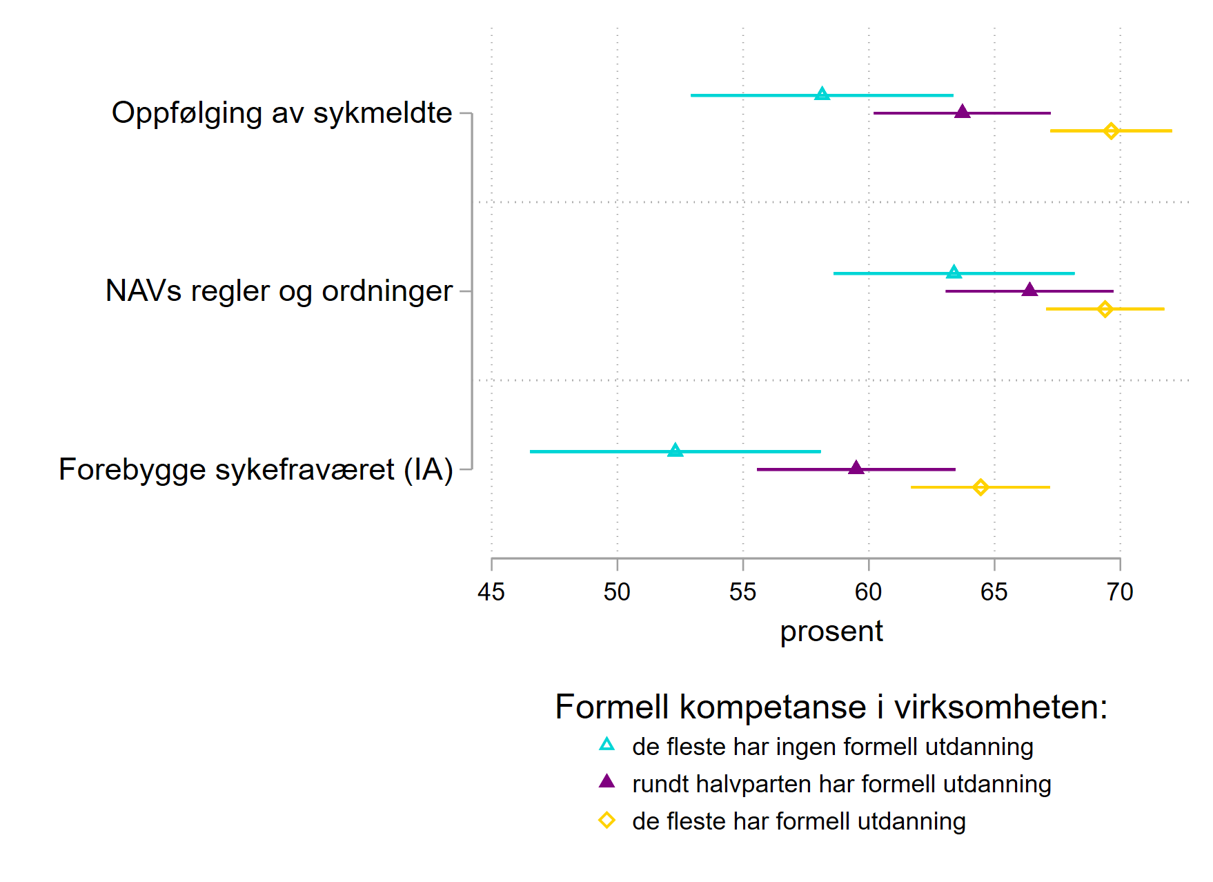 Vurderingen av Nav-ansattes kompetanse på to områder, oppfølging av sykmeldte og forebygging av sykefravær (IA), øker med andelen av de ansatte i virksomhetene med formell utdanning (Figur 4.2), også når det kontrolleres for sektor og størrelse. Vi har ikke kunnet kontrollere for sykefravær i virksomheten, som har en mulig negativ sammenheng med graden av formell utdanning, og derfor at mer komplekse utfordringer leder til lavere vurdering av Nav-ansattes kompetanse på området. I tillegg er det en tendens til det samme på Navs kompetanse på regler og ordninger. På de andre kompetanseområdene i Figur 4.1 det ikke signifikant forskjell.