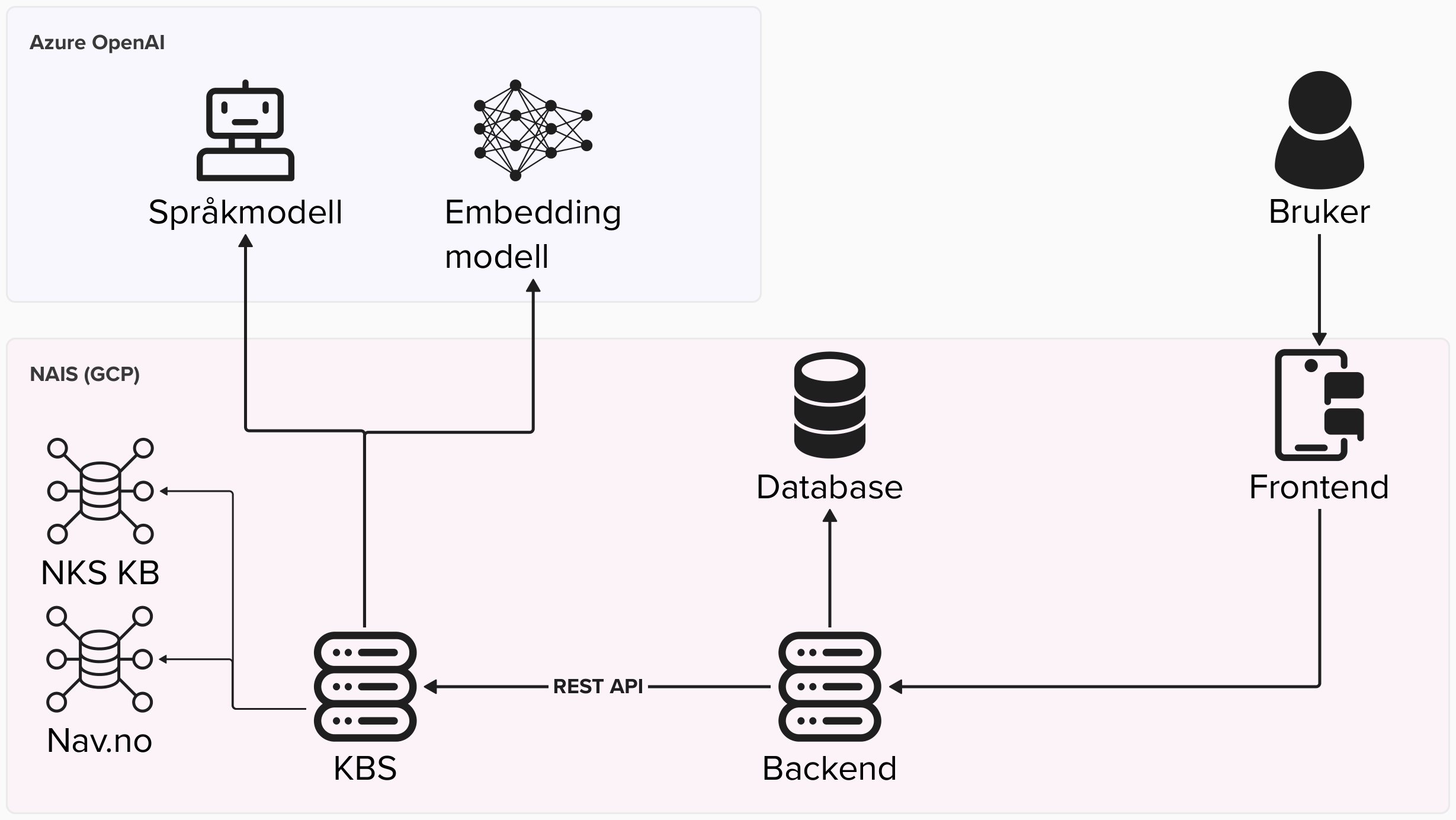 Det andre hovedpoenget med denne arkitekturen er å kjøre selve KBS systemet på NAIS plattformen og ikke på Azure eller Vertex AI sine no/low-code løsninger. Dette gir sterkere kontroll over systemet samtidig som man gjør seg mer uavhengig av tilbyder av språkmodell og det vil være med på å gi bedre kontroll over kostnader.
